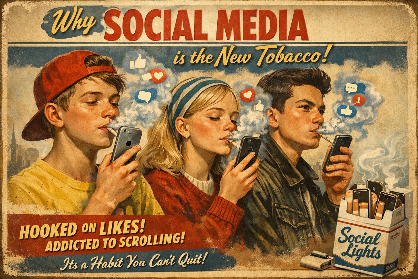 Today, we are sitting in a different waiting room, but the cough is just as persistent. Social media has become the “Big Tobacco” of the 21st century. It is a product designed for dependency; it has rewired an entire generation, it’s highly addictive, dangerous for individuals and society at large, but protected by a wall of corporate obfuscation, even as the data on societal “decay” becomes impossible to ignore.